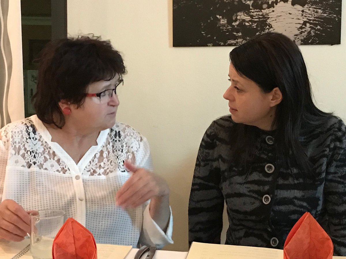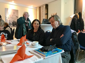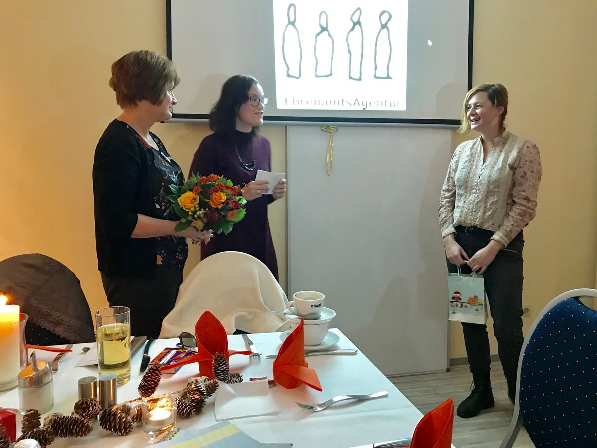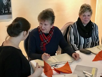 Vor dem Essen blickte Anja Pfotenhauer, die noch bis Ende Dezember als Projektleiterin fungiert, auf ihre Tätigkeit für die Guten Nachbarn zurück. Die Begegnungen mit wunderbaren Menschen, das Durchleben fröhlicher, aber auch trauriger Phasen - die gemeinsame Zeit wird Anja in schöner Erinnerung behalten. Sie hieß die beiden Nachfolgerinnen Sabine Meyer und Petra Strolka nochmals herzlich im Projekt willkommen und übergab symbolisch ein Diensttelefon aus Schokolade. Sabine Meyer hatte ebenfalls ein Dankschön für Anja vorbereitet.