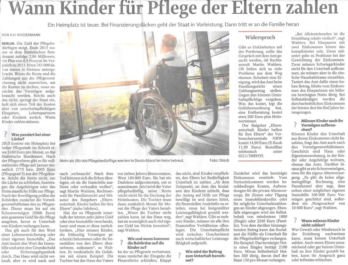 Wann müssen Kinder für die Pflege der Eltern bezahlen? Wie und wann kommen Behörden auf die Kinder zurück um Finanzierungslücken für Heimplätze zu schließen, wenn die Pflegeversicherung und Rente nicht ausreicht? Wie hoch ist das Schonvermögen, das nicht angetastet wird? Wann müssen Kinder nicht zahlen? Wie viel wird als Unterhalt angesetzt?All diese Fragen beleuchtet der eingescannte Artikel aus der TLZ vom 23.5.17.