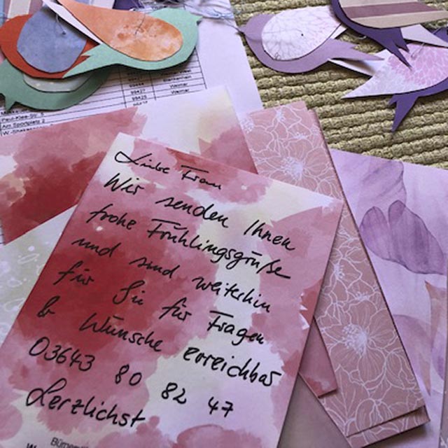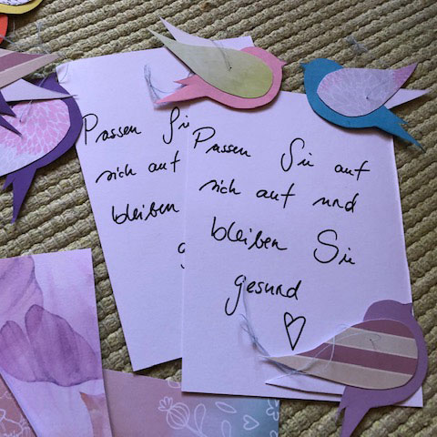 Ein kleines, selbstgebasteltes Vögelchen zum Anhängen an den Frühlingsstrauß sowie eine wunderschöne Karte mit persönlich geschriebenen Grüßen und herzlichen Unterstützungsangeboten für diese besondere Zeit...