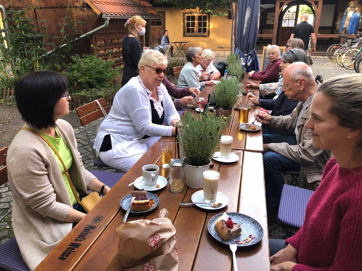 Im Anschluss gab es im Café Bienenstock bei leckerem (Zwiebel-)Kuchen und traditionellem Federweißen einen sonnigen Austausch über Erlebnisse und Erfahrungen im Ehrenamt als Guter Nachbar.