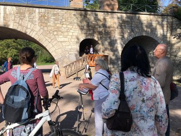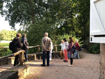 Von der Schlossbrücke, über das Ochsenauge, weiter zum kleinen, von Baumrinde ummantelten Ruhehaus oberhalb der Ilm, schilderte sie Anekdoten aus dem vom Bürgertum geprägten Leben Weimars.