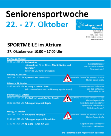 Seniorensportwoche vom 22.-27.10. im Atrium für Seniorinnen ab 65+ und Informationsveranstaltungen zum Thema Sport an verschiedenen Orten der Stadt.