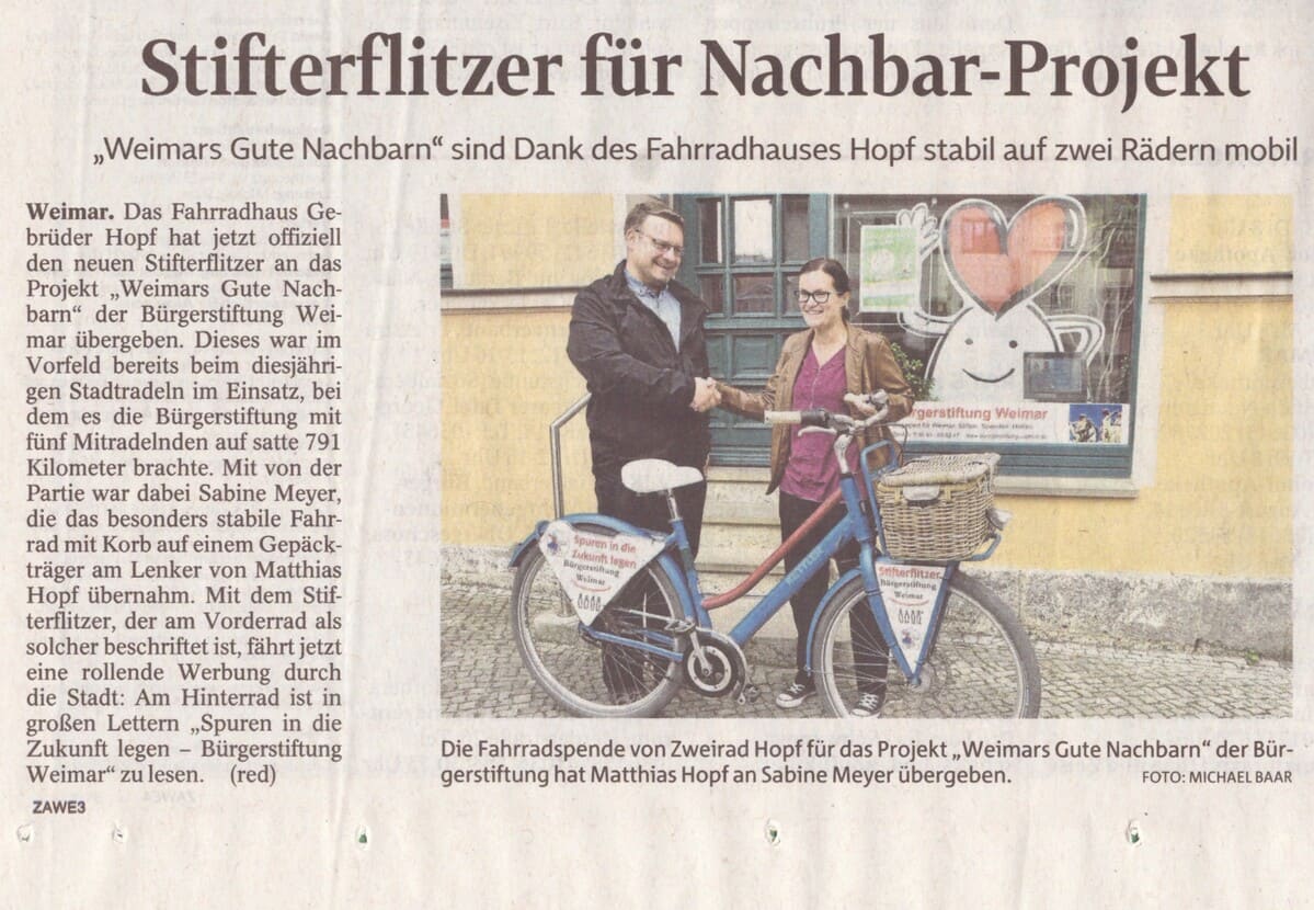 Nun ist es offiziell. Der Stifterflitzer des Projektes "Weimars Gute Nachbarn" wurde vom Fahrradhaus Hopf öffentlich übergeben. Unserer Projektleiterin Sabine Meyer nahm das äußerst bequem zu fahrende Rad von Matthias Hopf entgegen. Im Gepäckkorb transportieren wir nun immer auch unsere Flyer und Werbematerialien um jederzeit für den guten Zweck werben zu können. Auf dem "Parkplatz" vorm Haus wirbt es auch im Ruhezustand mit der schönen Beschilderung am Vorder- und Hinterrad.