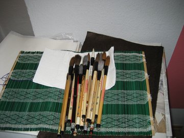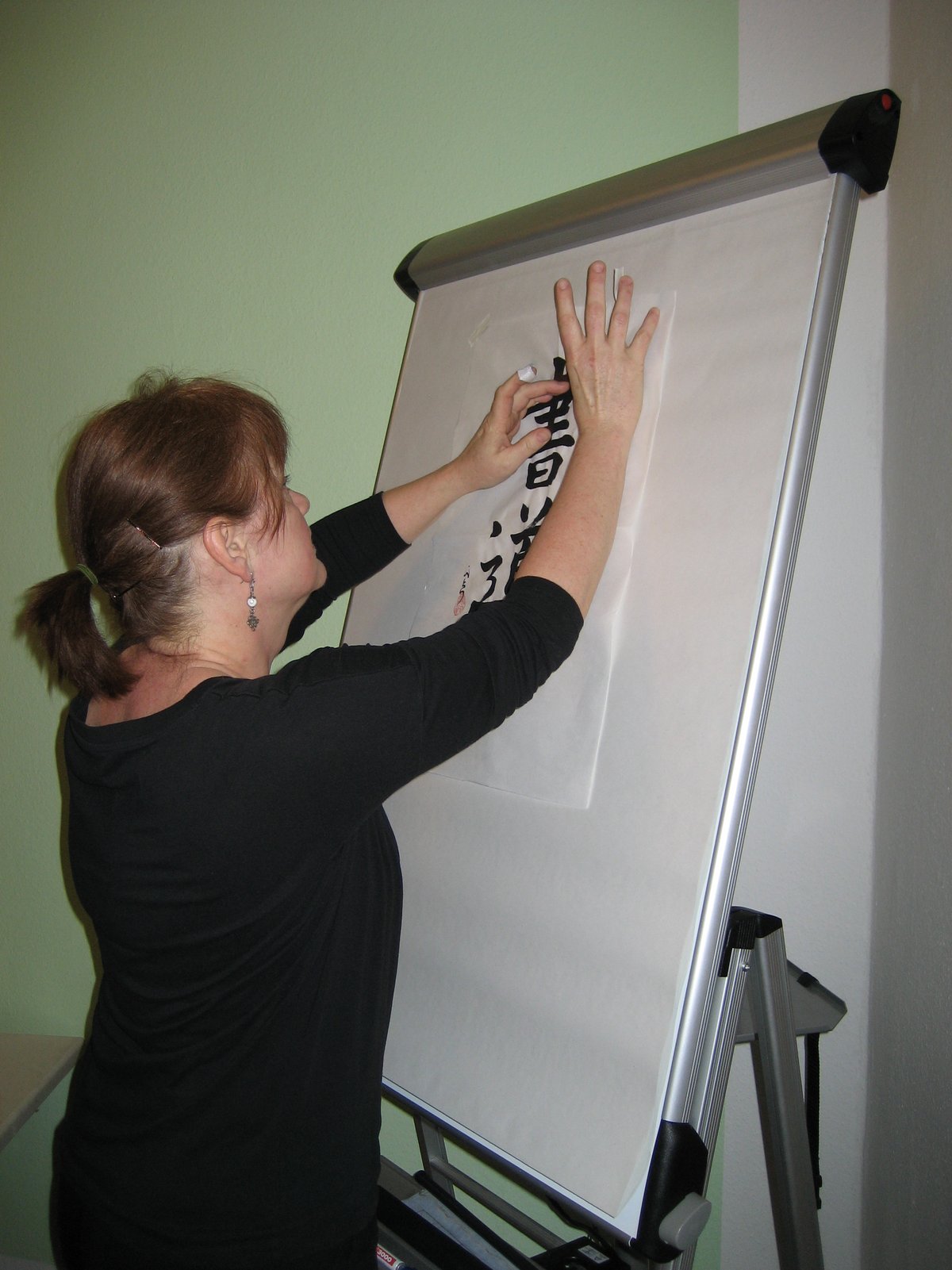 So wurde an diesem Abend von 15 Begleitern der Umgang mit japanischen Pinseln und japanischer Tusche probiert und ein erster kurzer Einblick in diese meditative Tätigkeit gegeben. Erste Schreibübungen wurden versucht und die auf Papier gebrachten Schriftzeichen konnten mit nach Hause genommen werden.