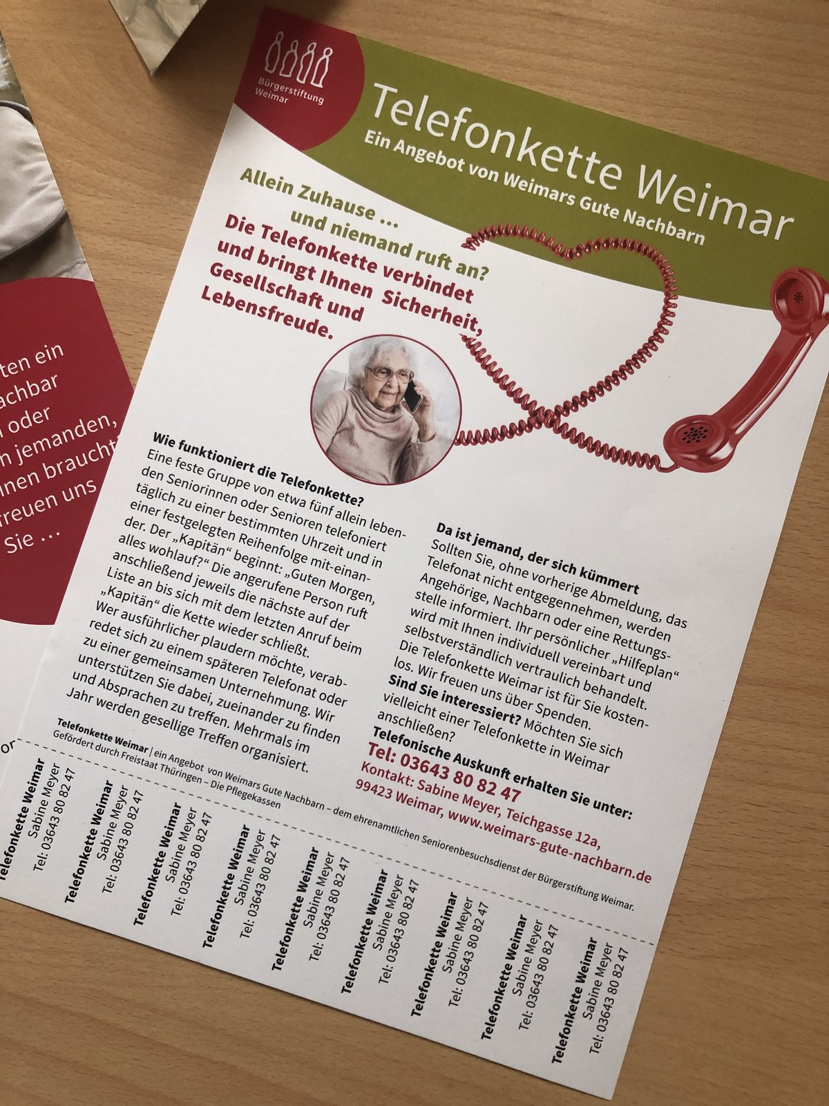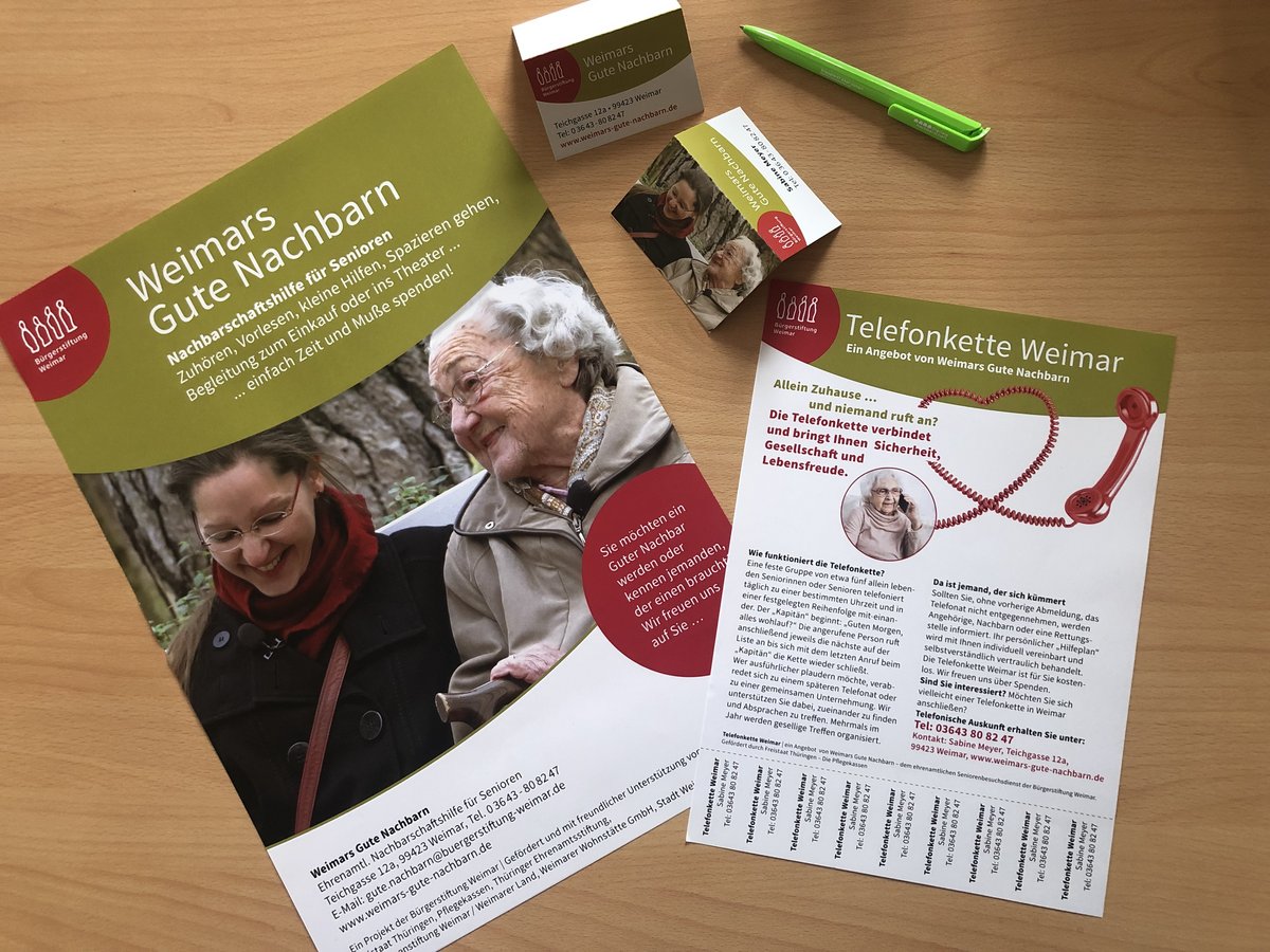 Mit den "Abreißschnippseln" am aktuellen Telefonketten-Plakat möchten wir insbesondere neue Mitglieder für eine dritte Telefonkette ansprechen! Für den Job des Telefonketten-Kapitäns suchen wir aktuell noch eine Persönlichkeit, die die neue Kette führen möchte. Natürlich mit Unterstützung von Weimars Gute Nachbarn.