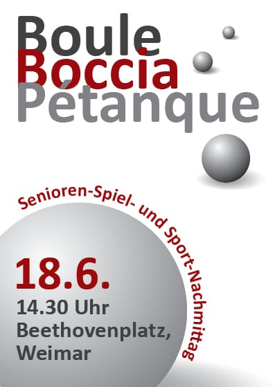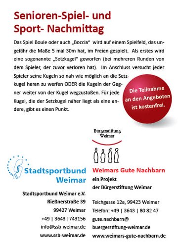 Am 18. Juni 2019 laden Weimars Gute Nachbarn zusammen mit dem Stadtsportbund Weimar e.V. zu einen Spiele- und Sport-Nachmittag ein. Auf dem Beethovenplatz wird die Kugel geschwungen.