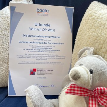 Das Geld dient der Förderung des Ehrenamtes vor Ort, dem Erreichen neuer Ehrenamtlicher und als Dank für mehrjährige ehrenamtliche Mitstreiter in Weimar und bei den Guten Nachbarn. Verliehen wurde der Preis von der Bundesarbeitsgemeinschaft der Freiwilligenagenturen e.V. und der Dr. Jürgen Rembold Stiftung.